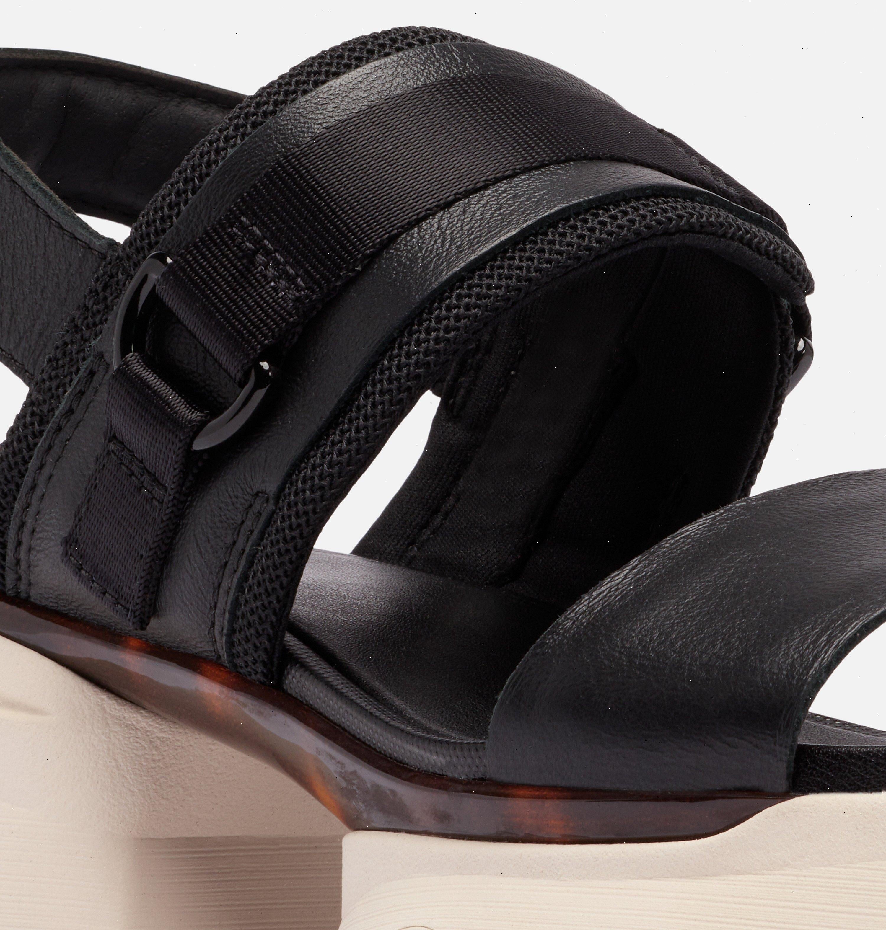 A supple leather forefoot strap anchors this silhouette, while an adjustable mesh midfoot strap—layered and accented by a sleek metal D-ring and refined webbing—delivers a statement with edge.